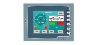 Pantalla táctil gráfica de 7,5" con 256 colores resolución de 640x480 píxeles. Teclado que incluye una tecla de menú y 6 teclas de función. Tres puertos de comunicación RS232, RS422 y RS485. También dispone de 2 puertos USB, 1 puerto de dispositivo USB y por medio de la ranura de tarjetas CF. Permite ampliar el registro y memoria de recetas, copia de seguridad.